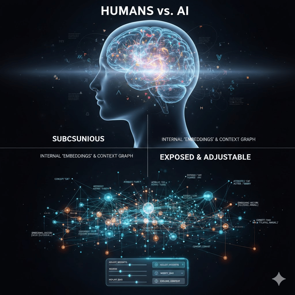 The big difference between humans and AI? We run most of these calculations subconsciously. We rarely see our own internal “embeddings” or context graph. With LLMs, everything is exposed and adjustable. That’s a massive advantage if you know how to use it.